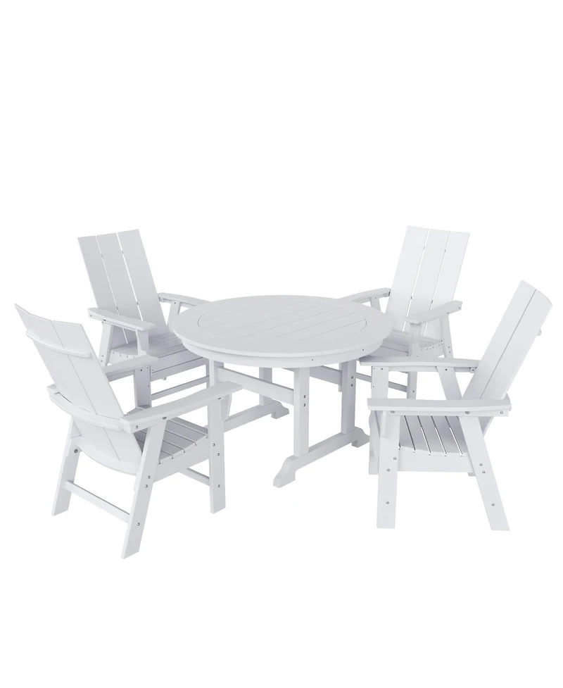 Impress your loved ones at your next outdoor family dinner with the 5-Piece outdoor dining set. This all-weather set seats up to four and curved-back dining chair with the look of modern Adirondack design. With a durable and spacious round dining table, this set is perfect for casual outdoor dining.