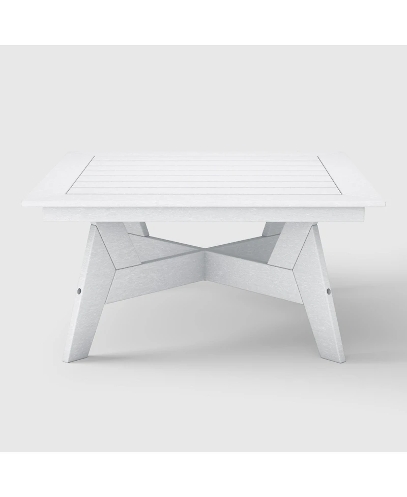 Enjoy leisure moments around this minimalist and modern outdoor coffee table. Crafted from durable Hdpe material, it's ideal for outdoor settings and sure to make a stylish statement. This versatile piece doubles as an outdoor patio conversation table, offering a spacious 36-inch-wide tabletop for drinks and snacks. Its X-cross brace frame design ensures stability and durability, making it a reliable addition to your outdoor space year after year.