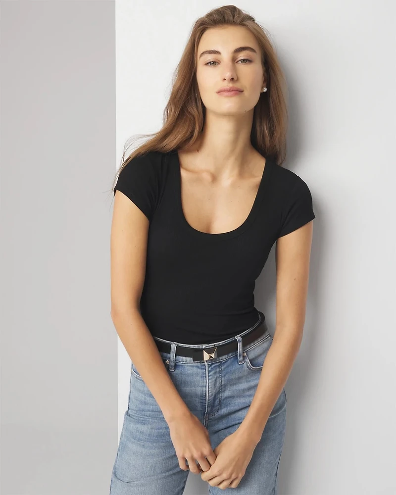 The soft ribbed fabric is all about comfort in this versatile tee that's a must-have for everyday outfits. The scoop neck and short sleeves make it easy to wear with so many different outfits, from casual to more dressed up, layered or worn on its own. • WHBMFORME™• Fitted• Scoop neck• 2x2 ribbing• 22" from shoulder• 91% Rayon, 9% Spandex. Machine wash. • Imported