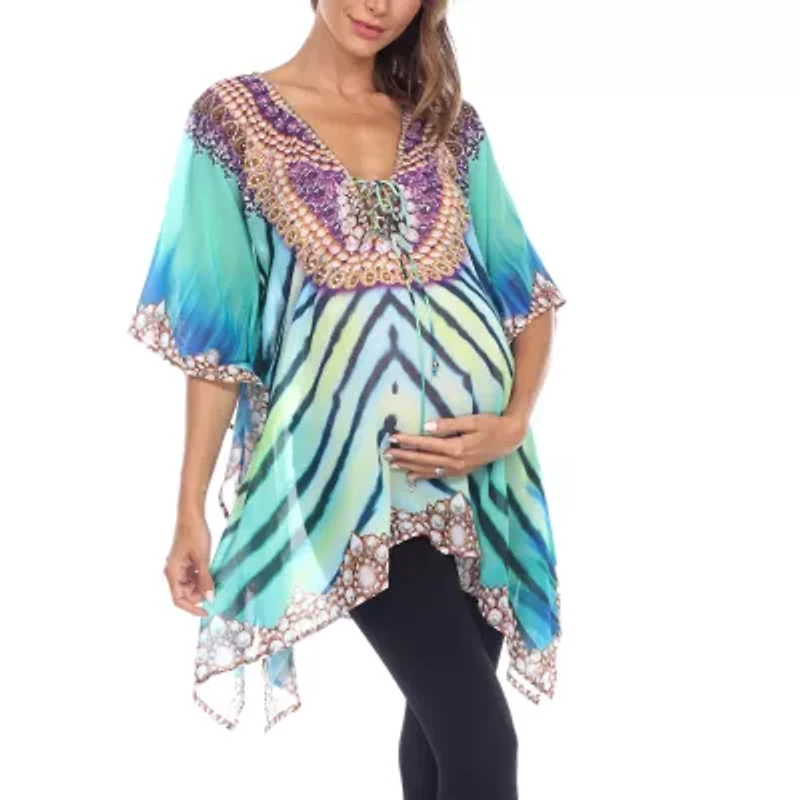 Bring chic and style in your maternity wardrobe. This caftan top features vibrant colors prints, adjustable neckline top and embellished rhinestones and kimono sleeves cut. Made with the softest fabric that is soft to the skin.