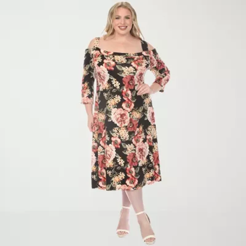 White Mark Womens Plus 3/4 Sleeve Midi Floral A-Line Dress