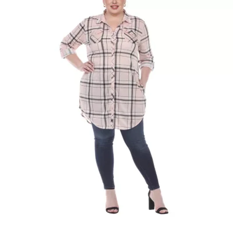 This White Mark women's plus plaid long-sleeve shirt top is a chic style for your cold-weather wardrobe. Cut from a smooth stretch-knit for a loose-fit, this long shirt has roll-tab sleeves, a spread collar, and multiple pockets. Wear it over leggings or skinny-fit jeans with ankle boots.