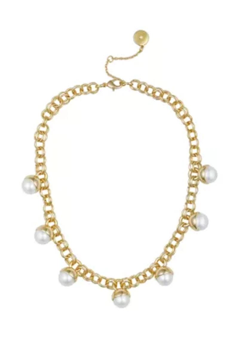 Elevate the everyday jewelry with this Vince Camuto station necklace. Crafted in 14K gold-tone metal, the design features luminous white pearls spaced delicately along the chain for a balanced, modern look. Wear it solo for subtle elegance or layer it to create a more dramatic statement. Lobster closure Imported Product Specifications 16" L Material & Care 14K gold plated metal Clean with a soft cloth