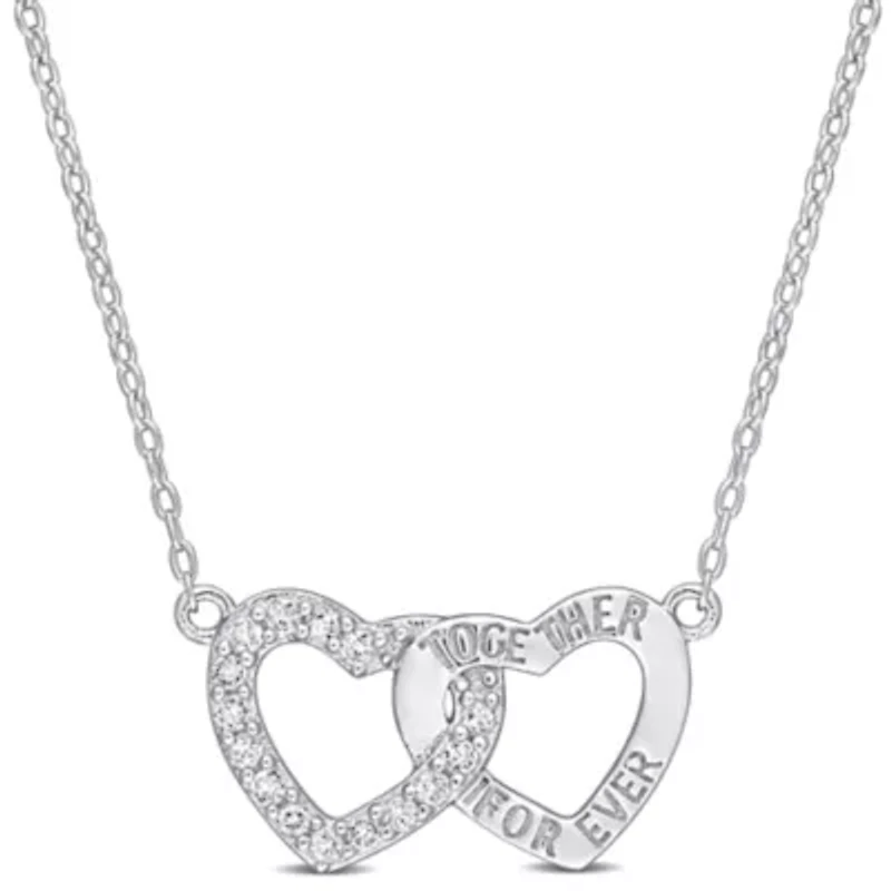 Celebrate love and connection with this beautifully designed two-heart pendant. Featuring sparkling white topaz, it captures a delicate brilliance that adds a touch of elegance to any look. The intertwined hearts symbolize unity and togetherness, making it a meaningful and romantic piece. Crafted in sterling silver, it offers a timeless and polished finish. A graceful necklace that expresses love, harmony, and enduring beauty. Spring ring clasp Polished finish Prong setting Warranty available, 60 days Thailand Imported Product Specifications 18" Material & Care Sterling Silver Metal, Sterling silver Clean with a soft cloth.