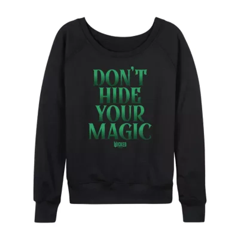 Stay warm in this inspiring Wicked pullover that reminds you not to hide your magic. Crafted from lightweight, breathable French terry, this relaxed-fit long sleeve graphic shirt features an oversized scoop neckline for an effortlessly stylish and comfortable look. It has a more fitted feel around the forearms while remaining loose through the shoulders and chest. Celebrate the untold story of Oz with Wicked graphic apparel. Featuring bold designs inspired by Elphaba, Glinda, and the magic of friendship and defiance, these pieces capture the spirit of the hit Broadway musical. With iconic logos, quotes, and enchanting artwork, Wicked apparel lets every fan show their love for this spellbinding story in style.