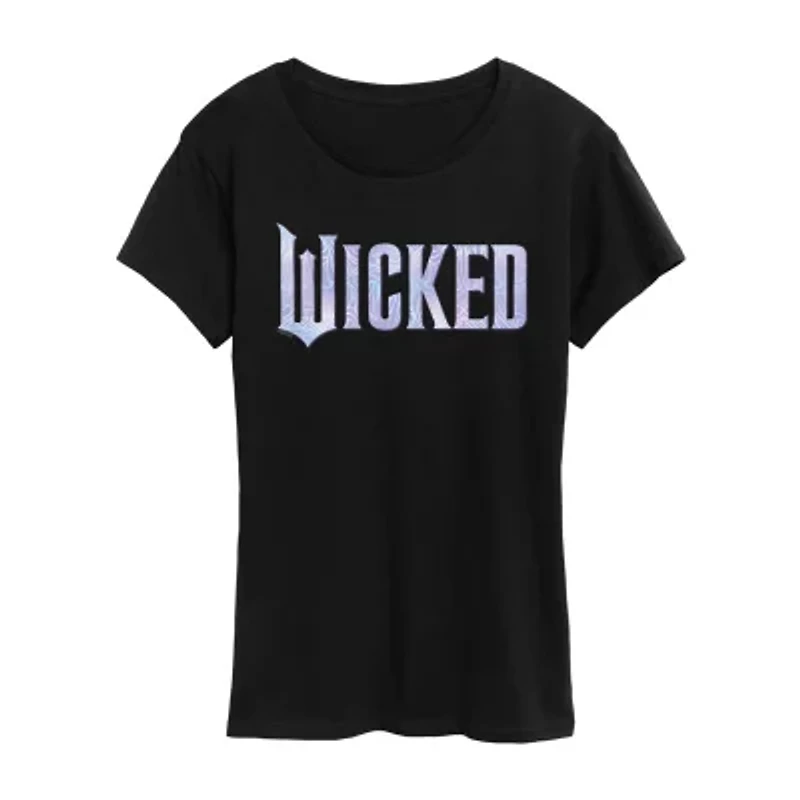 Wicked sparkle logo -women's short sleeve graphic t-shirt show off your bold side with wicked graphic apparel for womens. Inspired by the hit musical, these tees feature striking designs of elphaba, glinda, and the world of oz, blending dramatic style with a touch of rebellion—perfect for fans who like their fashion with a little magic and edge.