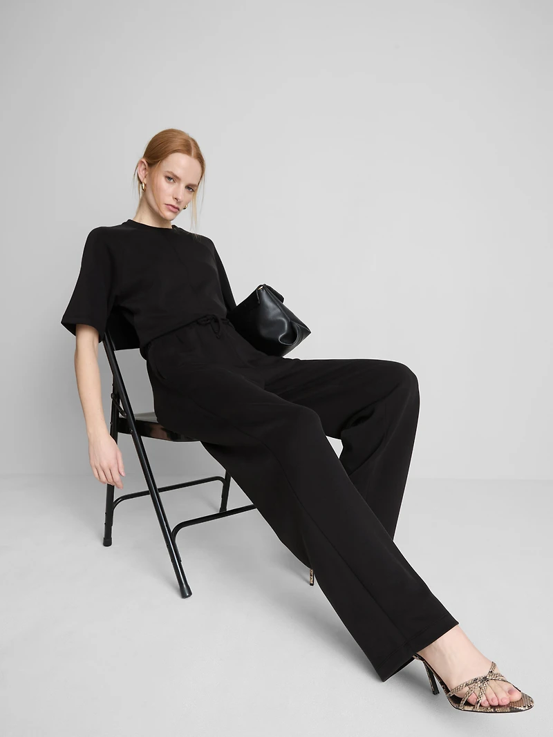 Relaxed wide leg pants with a drawstring waist and stitched hems
