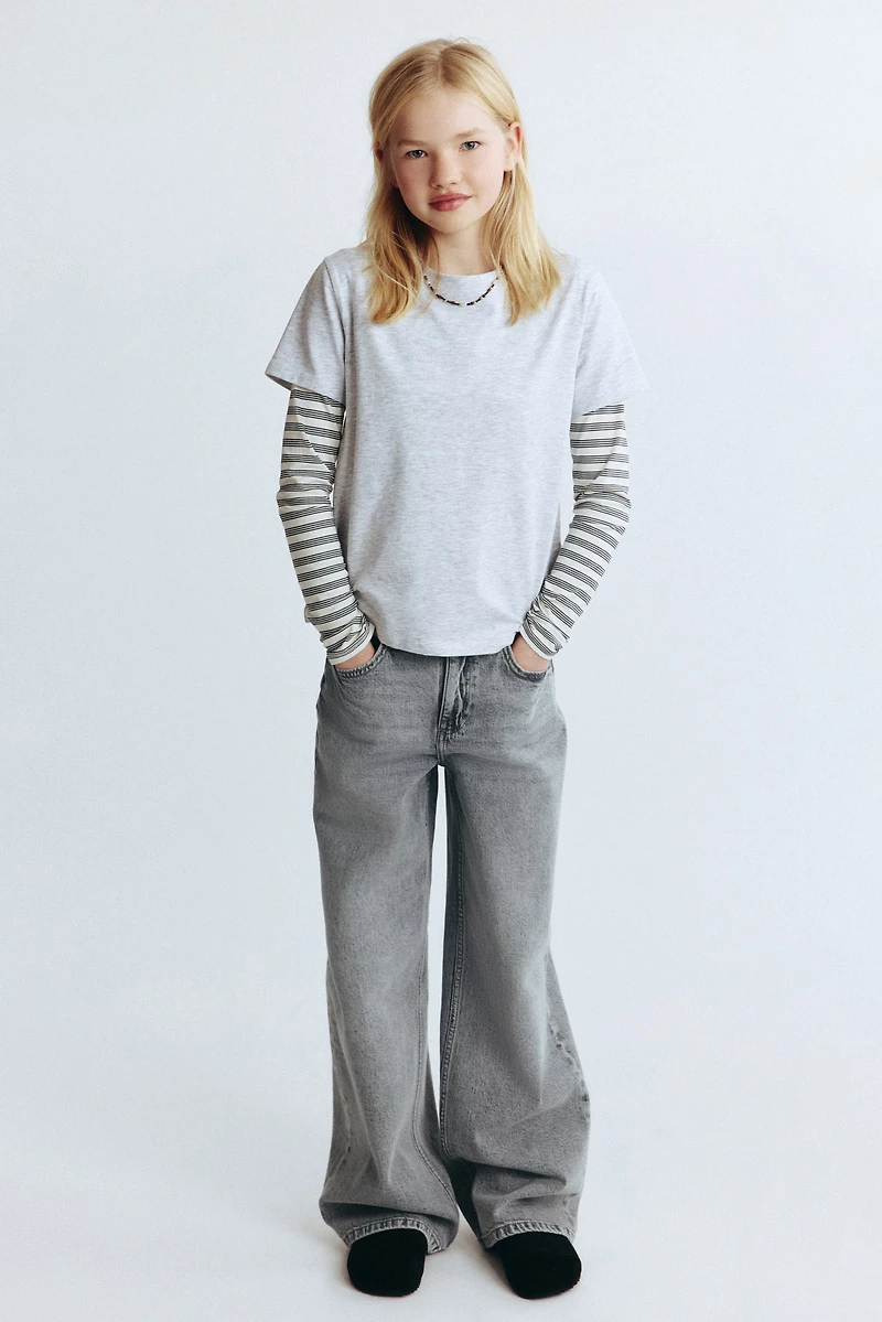 5-pocket jeans in washed cotton denim. High waist, adjustable, elasticized waistband, and zip fly with button. Wide legs.