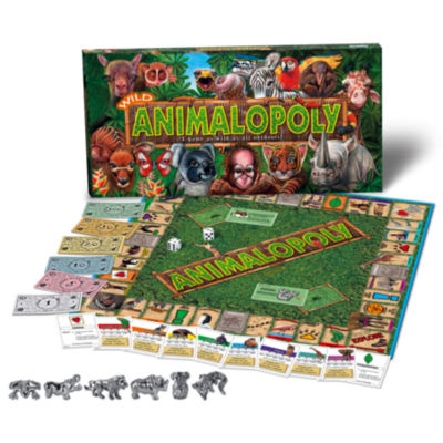 WILD ANIMAL-OPOLY has all the fun of a traditional real estate trading game with some wild animal twists. Instead of buying property, players become caretakers of animals. Instead of rent, players pay Meal Fees. A player collects 4 Elements - the land, water, food and clean air that all animals need to survive and trade them in for a Habitat where an animal can survive on its own. Flip over the Animal Certificates and you'll find several fun facts about each animal.