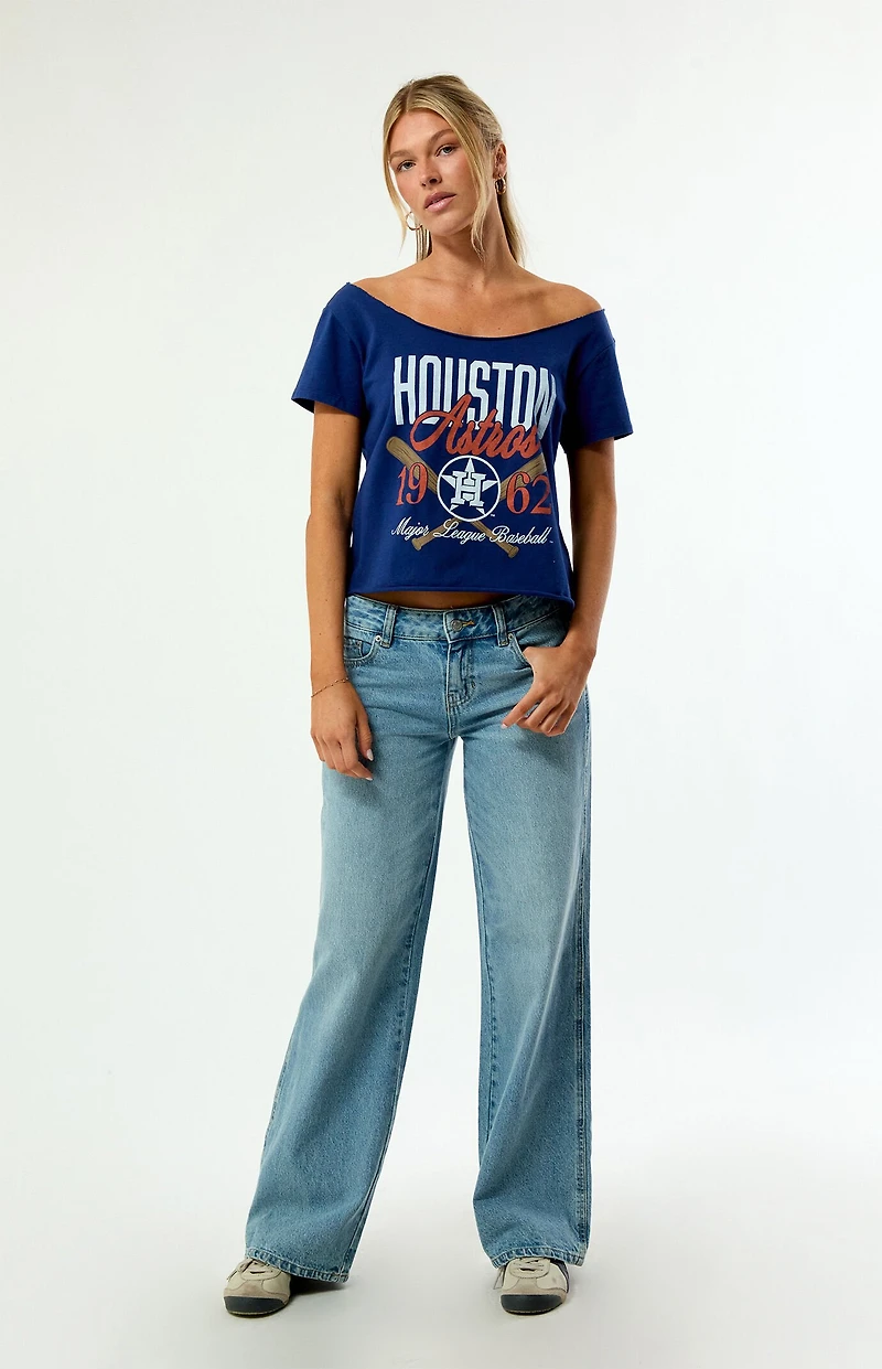 The Wild Collective x MLB Houston Astros Off-The-Shoulder T-Shirt brings sporty, laid-back vibes to your casual rotation. It features short sleeves, an off-the-shoulder design, a team front graphic, and a relaxed fit.