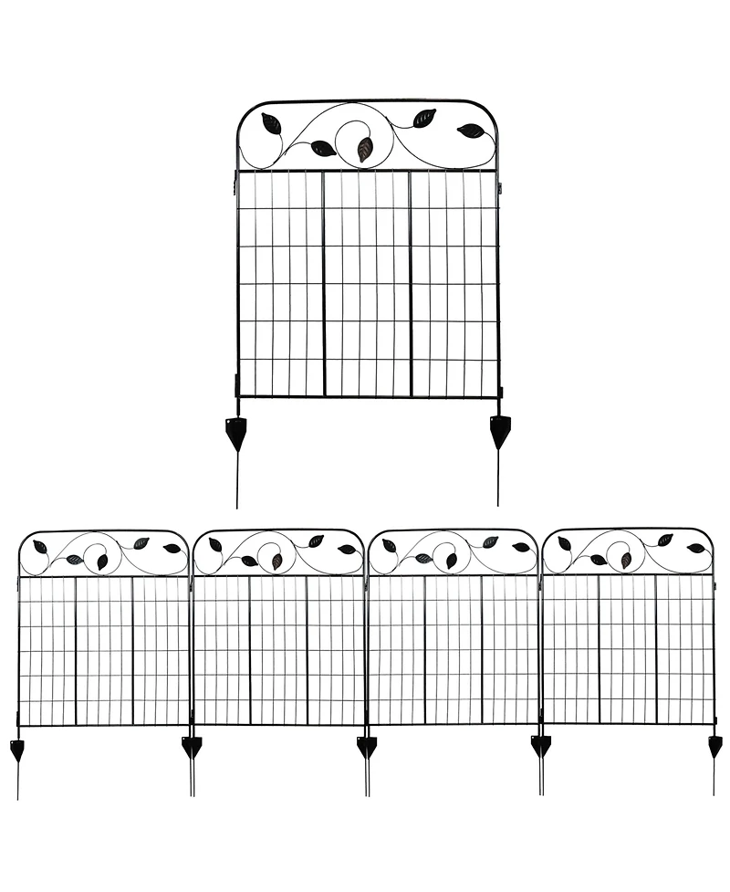 Create a border around a flower bed, pathway, or yard with these decorative garden fencing panels. Made from durable steel with a black powder coating, this set of 4 garden fencing panels is sure to last year after year in your yard or garden. The material is rust-resistant and weather-resistant, made to ensure outdoor use is a breeze. Each metal panel features leaves on a vine on a panel at the top and a wire fence design at the bottom for added elegance and protection. Each section is connected with a hook and loop on each side of the panel that are not rust-resistant and require a little more care and maintenance for longevity due to the material of the hardware. In addition, each panel stays upright effortlessly in the ground with the included 8 stakes. These fencing panels are sure to add an elegant accent to your outdoor space while providing protection when used to surround flower beds, bushes, and other plants.