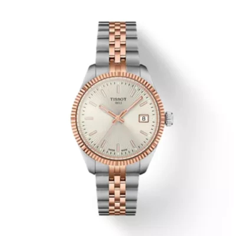 This watch is crafted to elevate your style for those truly special moments. The traditional guilloché dial with sunbeam rays reflects light beautifully, adding depth and elegance. The fluted bezel offers a sophisticated decoration representative of traditional watchmaking craftsmanship. The interchangeable quick-release bracelet offers maximum versatility, allowing you to easily change your look. Foldover clasp Analog dial Quartz movement Polished finish Date display Choking hazard Warranty available, Limited liability warranty, 2 Years of Warranty Switzerland Imported Product Specifications 34.00 mm 8.25 mm Material & Care Stainless steel Clean with a soft cloth.