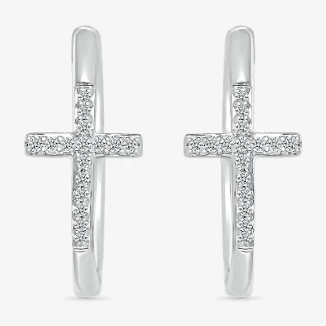 Womens 1/8 CT. T.W. Natural White Diamond Sterling Silver 15.8mm Cross Hoop Earrings