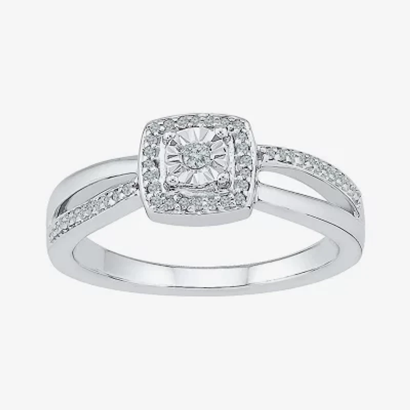 Womens 1/8 CT. T.W. Natural White Diamond Sterling Silver Cushion Side Stone Halo Promise RingWomens 1/8 CT. T.W. Natural White Diamond Sterling Silver Cushion Side Stone Halo Promise Ring