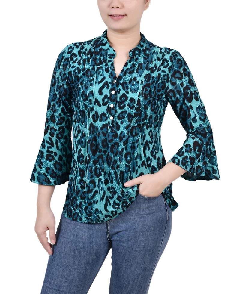 Women's 3/4 Bell Sleeve Pleat Front Y-neck Top