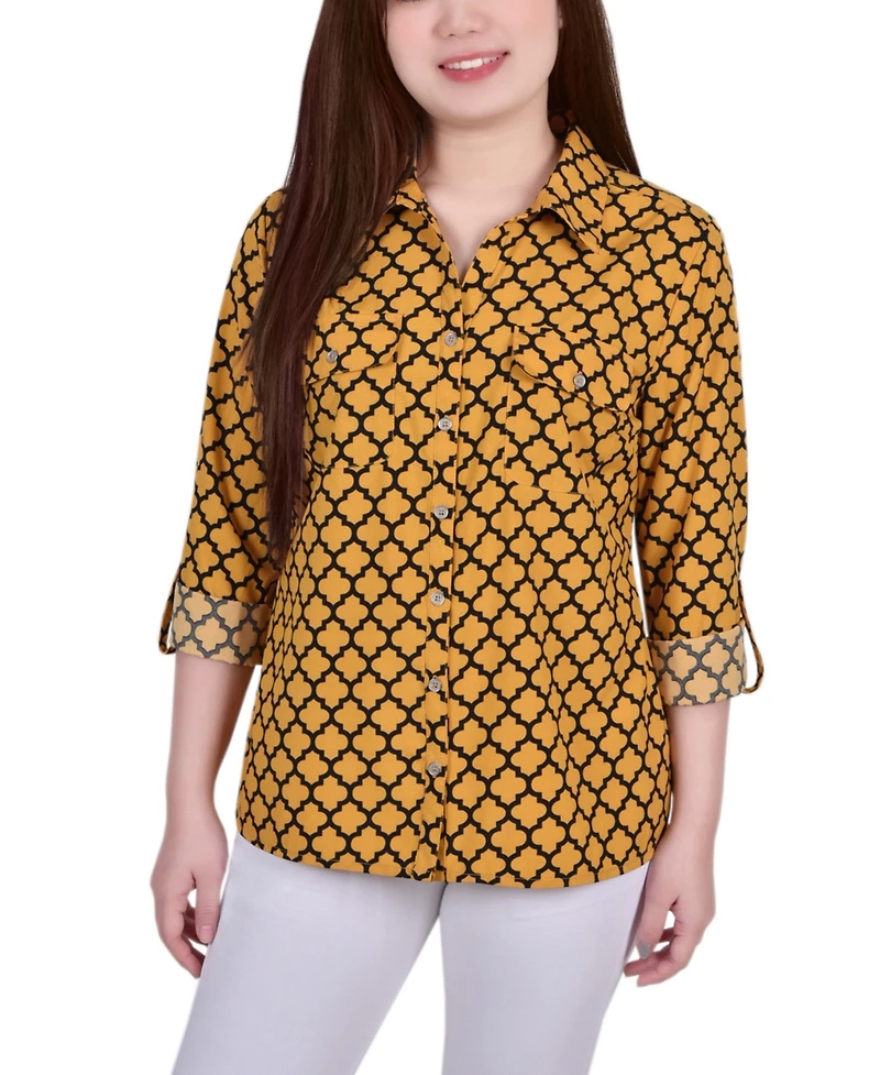 Lots of details make this Ny Collection blouse a must have this season with it's bias cut placket and chest pockets.