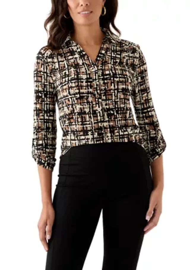 Petite 3/4 Scrunched Sleeve Printed Button Down Shirt