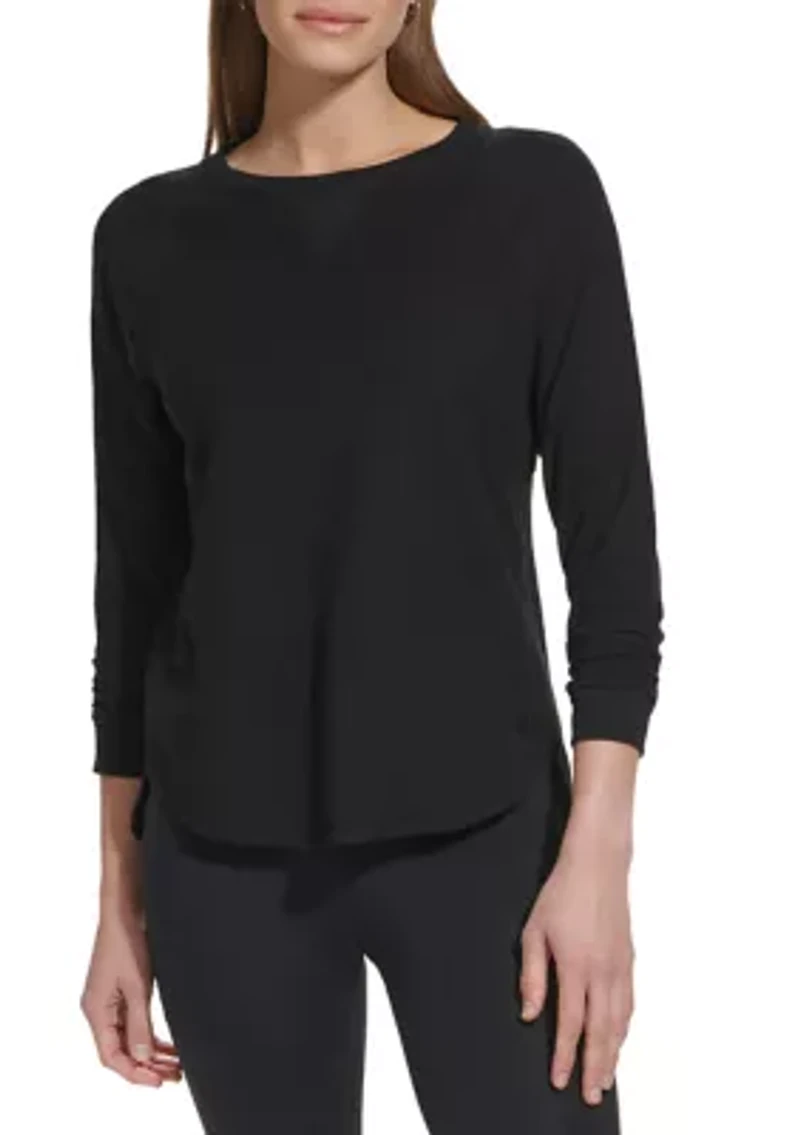 Perfectly paired with your favorite leggings and sneakers, this t-shirt from DKNY Sport takes you stylishly from the studio to the street. Pullover Crew neck 3/4 ruched sleeves Unlined Imported Product Specifications 25" L Material & Care Cotton, polyester Machine washable