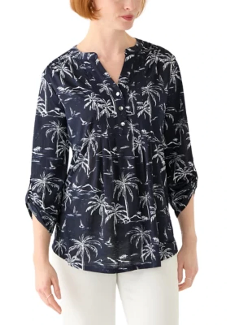 Add a coastal flair to your closet with this printed top from Kim Rogers®. Button closure Henley neck 3/4 roll-tab sleeves Imported Belk Exclusive Product Specifications 28.5" L Material & Care Polyester, spandex Machine washable