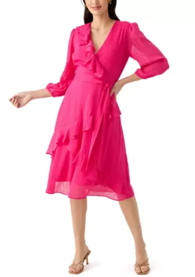 Women's 3/4 Sleeve Solid Belted Midi Chiffon Fit and Flare Dress