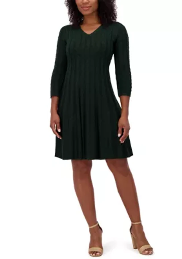 Women's 3/4 Sleeve V-Neck Solid Pleated A-Line Dress