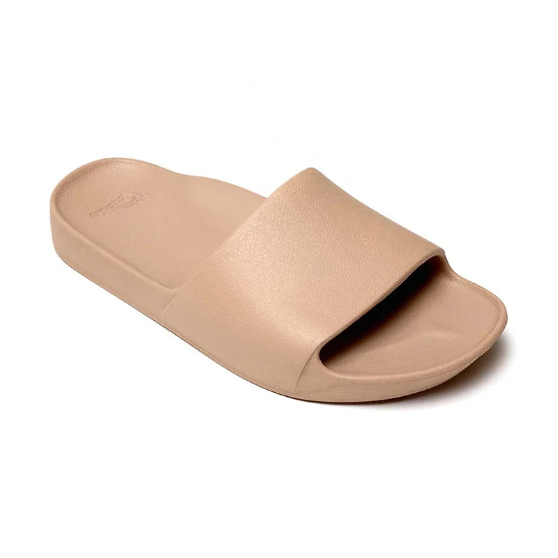 Women's Archies Arch Support Slide - Taupe Introducing our all new Arch Support Slides. So comfy and supportive, you'll never take them off! DETAILS: Up to 2.2cm of orthotic support encourages optimal foot posture aiding whole body alignment. Perfect for people with Plantar Fasciitis. Our specialized closed cell foam material is formulated to mold to the shape of your foot. Give them a day or two to wear in and you'll be in love with your Archies! Helps to reduce stress on the calf and Achilles tendon - great for people with Achilles Tendonitis. Our ultra-strong one-piece design makes Archies Slides extremely durable!