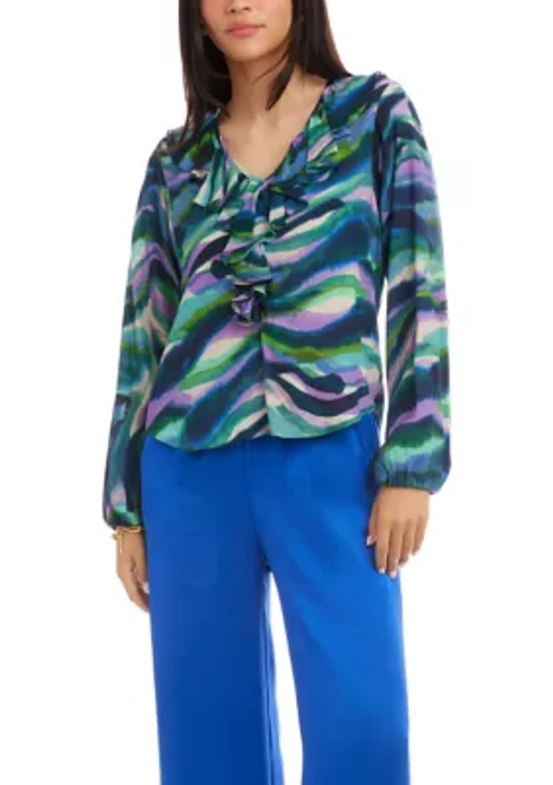 Playful yet polished, this Karen Kane top is crafted in lightweight crepe and showcases a painterly watercolor print for an artful touch. The soft V-neckline is framed by cascading ruffles that add feminine charm, while the long blouson sleeves with elasticized cuffs create a voluminous, romantic silhouette. Pullover Ruffle V-neck Long blouson sleeves Unlined Imported Product Specifications 23.75" L (size medium) Material & Care 51% viscose, 49% ecovero Machine washable