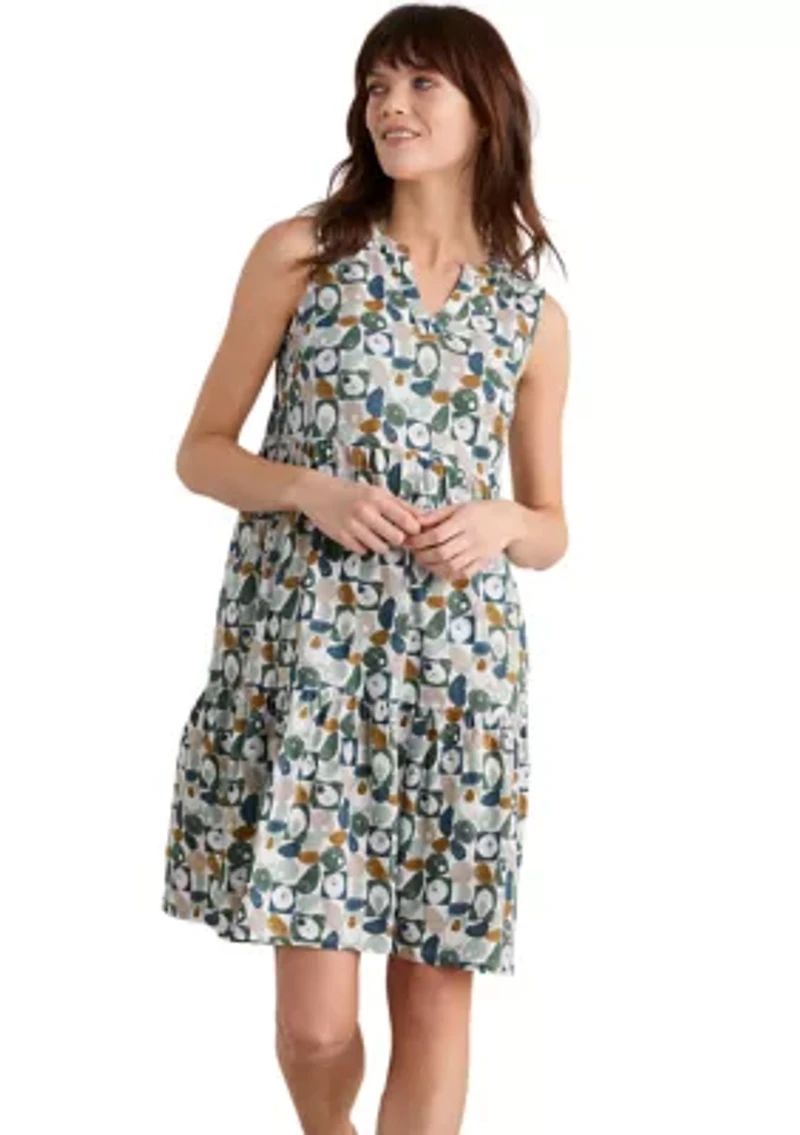 Sleeveless organic cotton above-the-knee jersey dress, with a notch neckline, easy flared shape, and subtle gathered tiers. Perfect for holiday packing. Pullover Split neck Sleeveless Unlined Imported Product Specifications 39" L Material & Care Cotton Machine washable