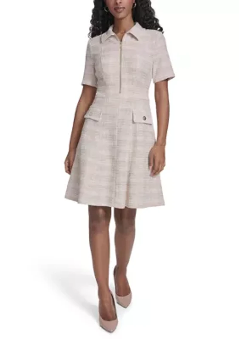This lovely Tommy Hilfiger dress, with its charming fit-and-flare silhouette and shimmering bouclé knit, offers a chic look that's perfect for all-day wear. Zip closure Collar Short sleeves Unlined Imported Product Specifications 36" L Material & Care Polyester, cotton, spandex Dry clean only