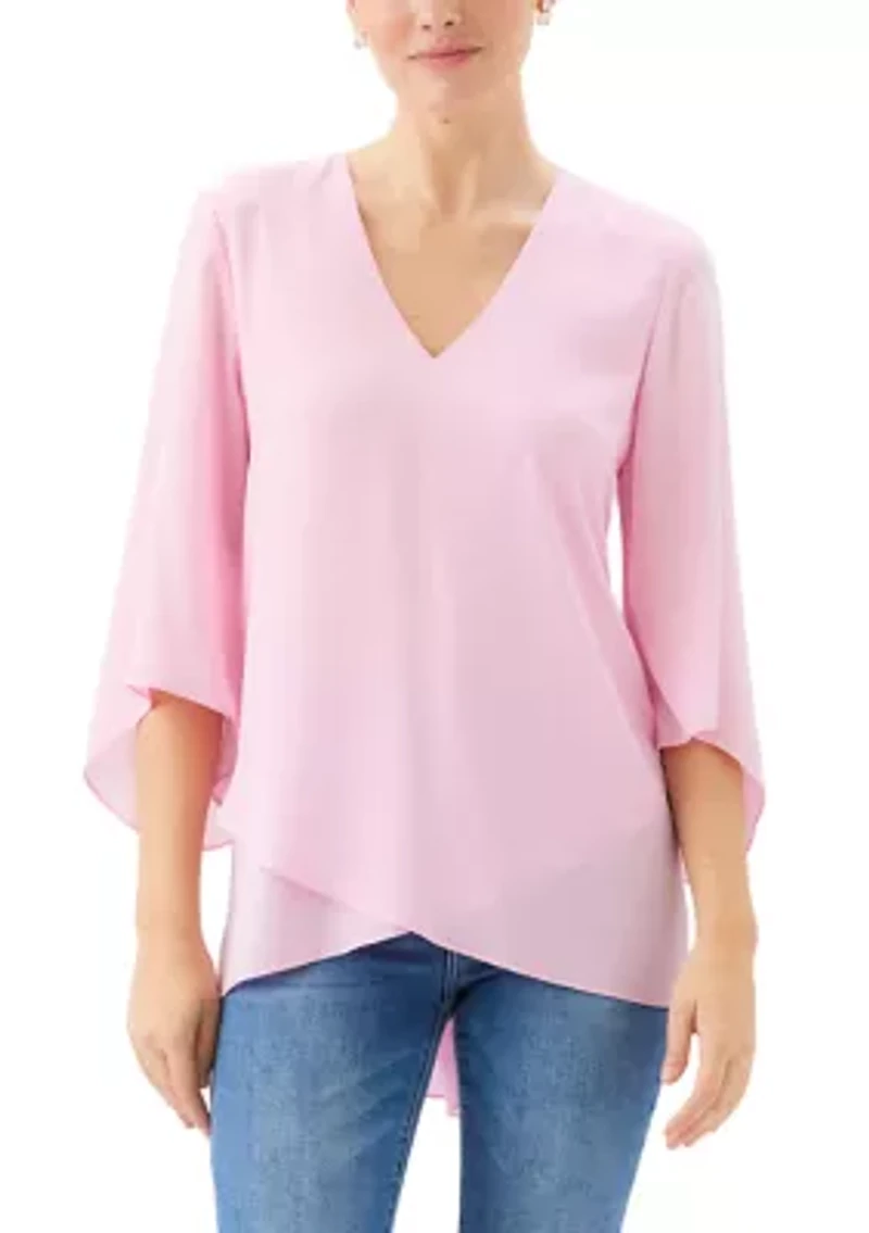 A graceful top from Karen Kane, crafted in silky crepe fabric, featuring an asymmetrical layered hem, a flattering V-neckline and soft flared sleeves. Lightweight and fluid with beautiful drape for an effortless, polished look. Hand wash cold, hang to dry Do not dry clean 100% polyester Made in the USA of Imported fabric Pullover V-neck 3/4 sleeves Unlined Imported Product Specifications 26.375" L Material & Care 100% polyester Hand wash