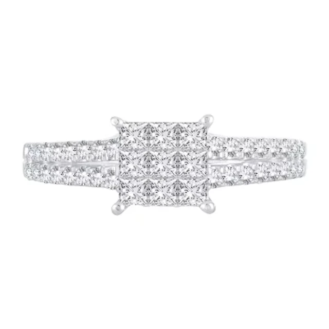 Womens 1 CT. T.W. Natural White Diamond 10K Gold Side Stone Halo Engagement Ring