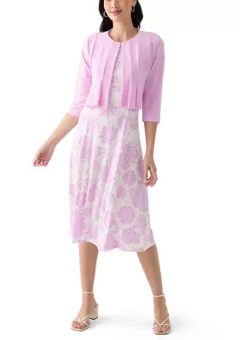 A solid jacket layers effortlessly atop a tonal floral print dress from Julian Taylor. Hook and eye closure Round neck 3/4 sleeves Unlined Imported Product Specifications 44.5" L Material & Care Polyester, spandex Machine washable