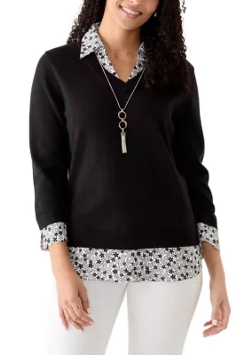 This versatile top from Alfred Dunner features a two-in-one design, and its floral woven trim adds a touch of charm, creating a classic, flattering style. Pullover Collar Long sleeves Imported Product Specifications 27" L Material & Care Cotton Machine washable