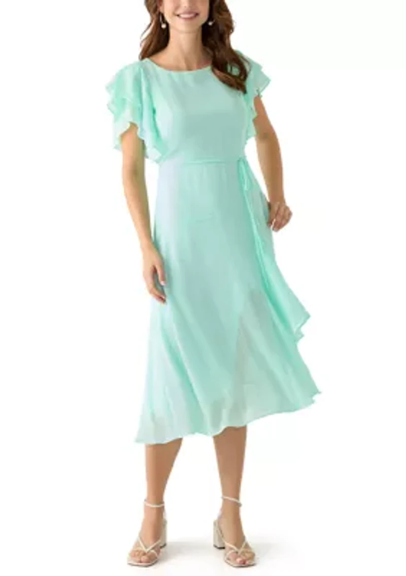 This charming midi dress exudes effortless elegance, perfect for any casual occasion. Its fit-and-flare silhouette flatters your figure, while the invisible zip closure ensures a smooth, polished look. Crafted from 100% polyester, this dress offers both comfort and durability. The crew neckline adds a touch of sophistication, while the flutter sleeves and single-layer ruffle sewn into the front slit opening add a playful touch. Please note that this dress has no pockets. Invisible zip closure Crew neck Short flutter sleeves Lined Imported Product Specifications 48" L Material & Care Polyester Hand wash