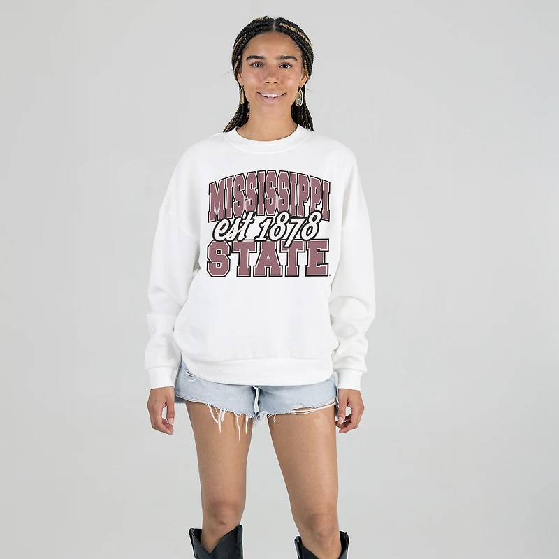 Women's Gameday Couture White Mississippi State Bulldogs Oversized Faded Formation Premium Fleece Sweatshirt in Franklin, TN