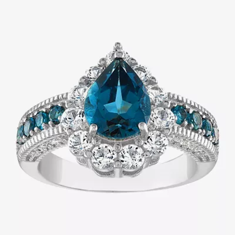 Bring color to your evening ensemble with this beautiful women's cocktail ring showcasing a pear-cut Genuine Blue Topaz surrounded by a shimmering halo of round-cut Lab-Created Sapphires. Crafted from Sterling Silver, the ring's band is also adorned with additional stones that perfectly complement the centerpiece.