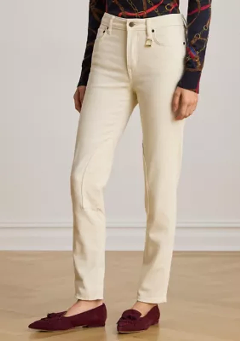 Crafted with comfortable left-hand twill denim, these Lauren Ralph Lauren high-rise skinny ankle jeans reflect Ralph Lauren’s equestrian spirit with jodhpur-inspired self-knee patches. High-Rise Skinny Ankle: sits above the natural waist. Slim through the hip and thigh with a skinny leg. US size 8 has an 11.5" rise and a 12.5" leg opening. All sizes have a 28" inseam. Belt loops. Zip fly with a buttoned closure. Five-pocket styling with metal rivets. Metal button and rivets custom-developed with a "Lauren Ralph Lauren" logo. Debossed signature leather patch at the back right waist. Self-knee patches. Shell: 99% cotton, 1% elastane. Logo patch: 100% leather. Machine washable or dry clean. Imported. Model is 5'10" (178 cm) and wears a US size 4.