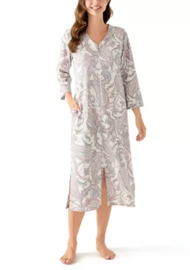 Miss Elaine Feather Print 3/4 Sleeve Round Neck Interlock Knit Long Zip Robe