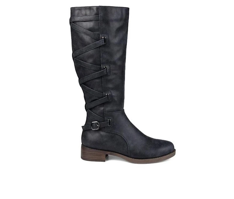 Women's Journee Collection Carly Knee High Boots If you love a good riding boot, then you�ll love the Carly boot by Journee Collection. This boot has such a different look to it with the zig zag lace detail. It�s so quirky and can easily spice up any winter outfit. This boot also features an almond toe shape and a distressed coloring.