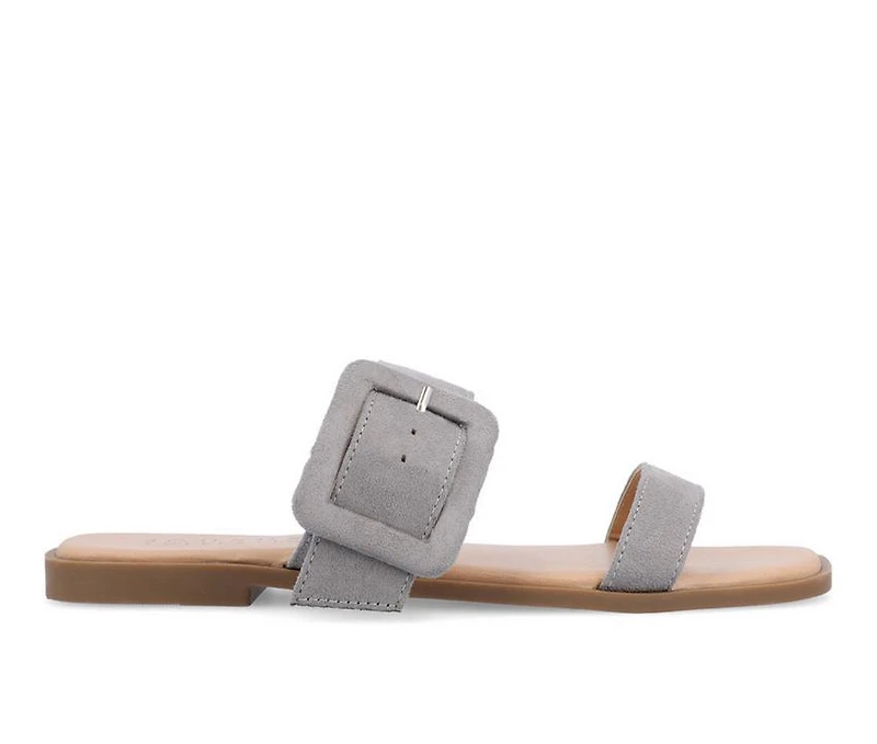 Women's Journee Collection Kerris Sandals The Kerris slip-on sandal from Journee Collection will have you go from boring to adoring. Their supple vegan leather, multi-strap design, slide style, and open square toe will give you the style to walk around town, attracting a few compliments wherever you go. To keep things easy, a 4 mm Tru Comfort Foam™ insole and slip-on closure will keep your feet comfortable with every step.