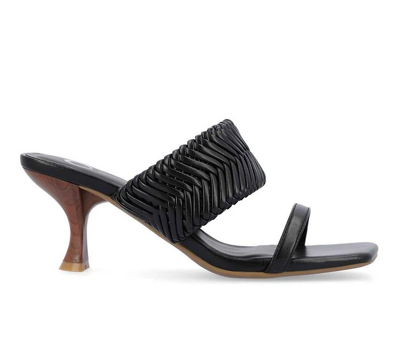 Women's Journee Collection Monyka Dress Sandals Our Monyka stiletto heel from Journee Collection will be the comfiest heel you've ever put on with their 4 mm Tru Comfort Foam™ insole. As well as comfort, you will have all the style you could dream of with their luxe vegan leather, woven band mule style, and open square toe. To keep it simple, they're slip-on, perfect for last-minute plans when you have to rush out the door.