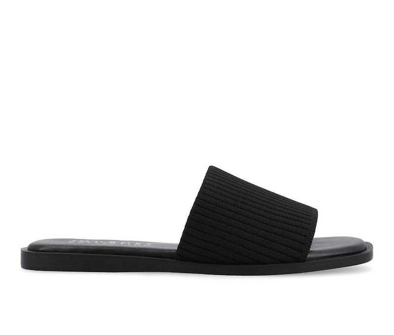 Women's Journee Collection Prisilla Sandals The Prisilla sandal from Journee Collection offers a stylish and comfortable fit with its flat sole and slip-on design. The single band strap and open toe style enhance its minimalist yet chic aesthetic. Crafted with fabric for both the upper material and lining, and featuring a 4 mm Tru Comfort Foam™ footbed, these sandals prioritize both fashion and comfort, making them a versatile and laid-back choice.