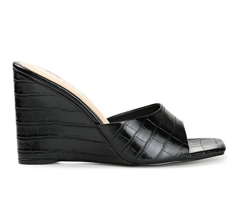 Women's Journee Collection Vivvy Wedge Dress Sandals The comfortable heels you've been waiting for, the Vivvy by Journee Collection. This slip-on silhouette features croc textured vegan leather uppers complemented by a 4 mm Tru Comfort Foam™ footbed for a comfortable fit. A simple band at the toe and a lofty wedge heel define the shape.