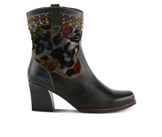 L Artiste Women s Georgiana Hand-Painted Leather Booties with Decorative Buckle, Rainbow Stitching, and Full-Zip Closure – French-Inspired Comf