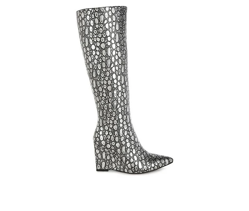 Women's London Rag Bar Zone Knee High Boots Bold detailing and sculpted lift define these standout boots. Crafted with a faux leather upper and metallic exterior accents, this silhouette delivers striking visual texture. The closed pointed toe refines the shape, while the zipper closure allows for easy on and off. Finished with a 3.5-inch slim wedge heel and durable TPR outsole, this pair balances height with confident structure.