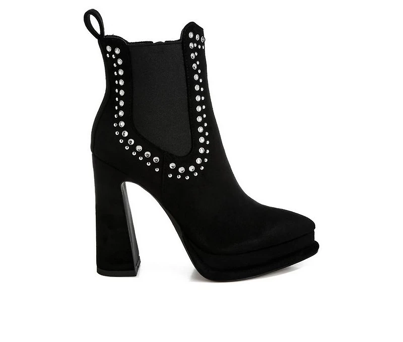 Women's London Rag Dalton Booties Rustic edge meets bold structure in these statement boots. Featuring a microfiber upper and a closed pointed toe, this silhouette delivers sleek definition with strong presence. Stud embellishments and elasticated gussets add texture and flexible comfort, while the zipper fastening allows for convenient wear. Finished with a 4-inch high flared block heel, double stack platform detail, and durable TPR outsole, this pair commands attention.