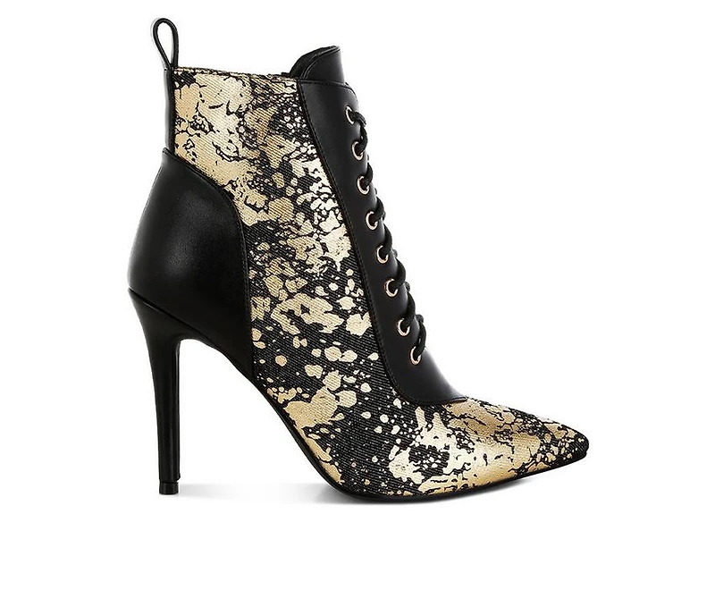 Women's London Rag Fat Cat Booties Bold attitude meets elevated height in these lace-up ankle boots. Designed with a faux leather upper and abstract splash pattern, this silhouette delivers striking visual impact. The closed pointed toe refines the shape, while the lace-up closure provides an adjustable fit. Finished with a 4-inch stiletto heel, pull tabs, and a durable TPR outsole, this pair blends edgy detail with confident lift.