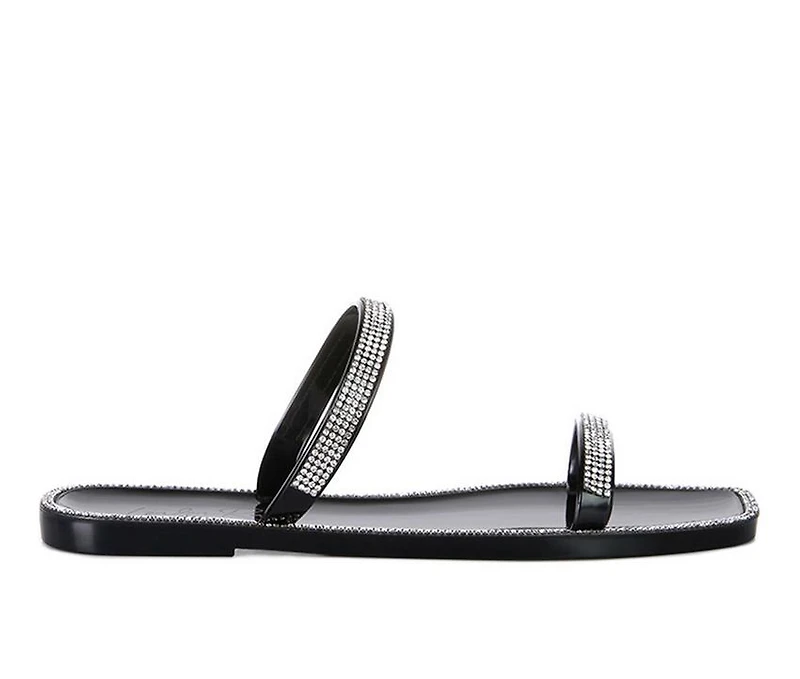 Women's London Rag Fenta Sandals Water-resistant soft jelly flats with beautiful sparkling diamante detail studs along with the straps and edges. The casual, comfy streetwear flats look gorgeous on the feet. Upper Material: TPV. Lining Material: TPV. Outer sole: TPV. Open Square Toe. Diamante Detail. Rainy Flats. Groovy Outsole. SH3192.