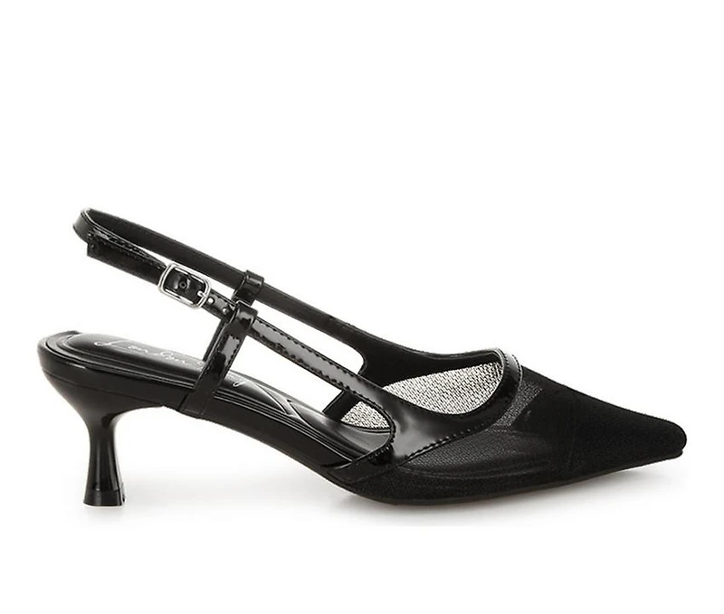 Women's London Rag Florina Pumps Chic slingback heels combine breathable mesh styling with a refined silhouette. The mesh upper adds visual texture while maintaining a sleek pointed profile. An adjustable buckle strap secures the fit while the kitten heel delivers subtle height. Designed for versatile styling, this pair transitions easily from daytime looks to evening outfits.