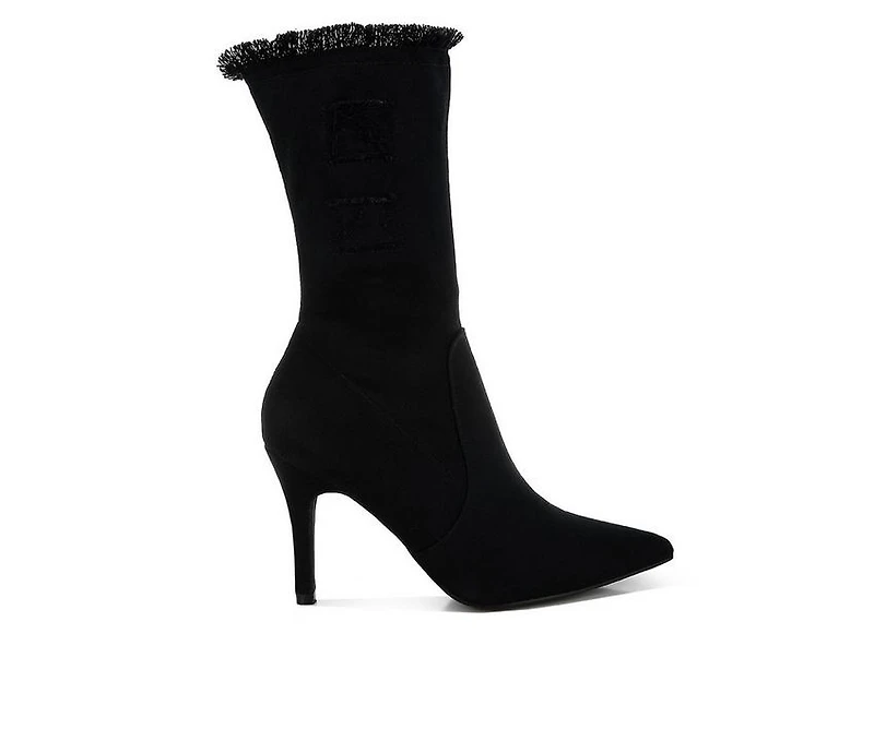 Women's London Rag Himkok Heeled Boots Channel vintage-inspired edge with these calf boots crafted in distressed denim. The denim upper features paneling and frayed trim for a bold, textured look. A side zipper closure makes them easy to slip on, while the closed pointed toe sharpens the silhouette. Finished with a 3.5-inch stiletto heel, this pair delivers standout height with confident style.